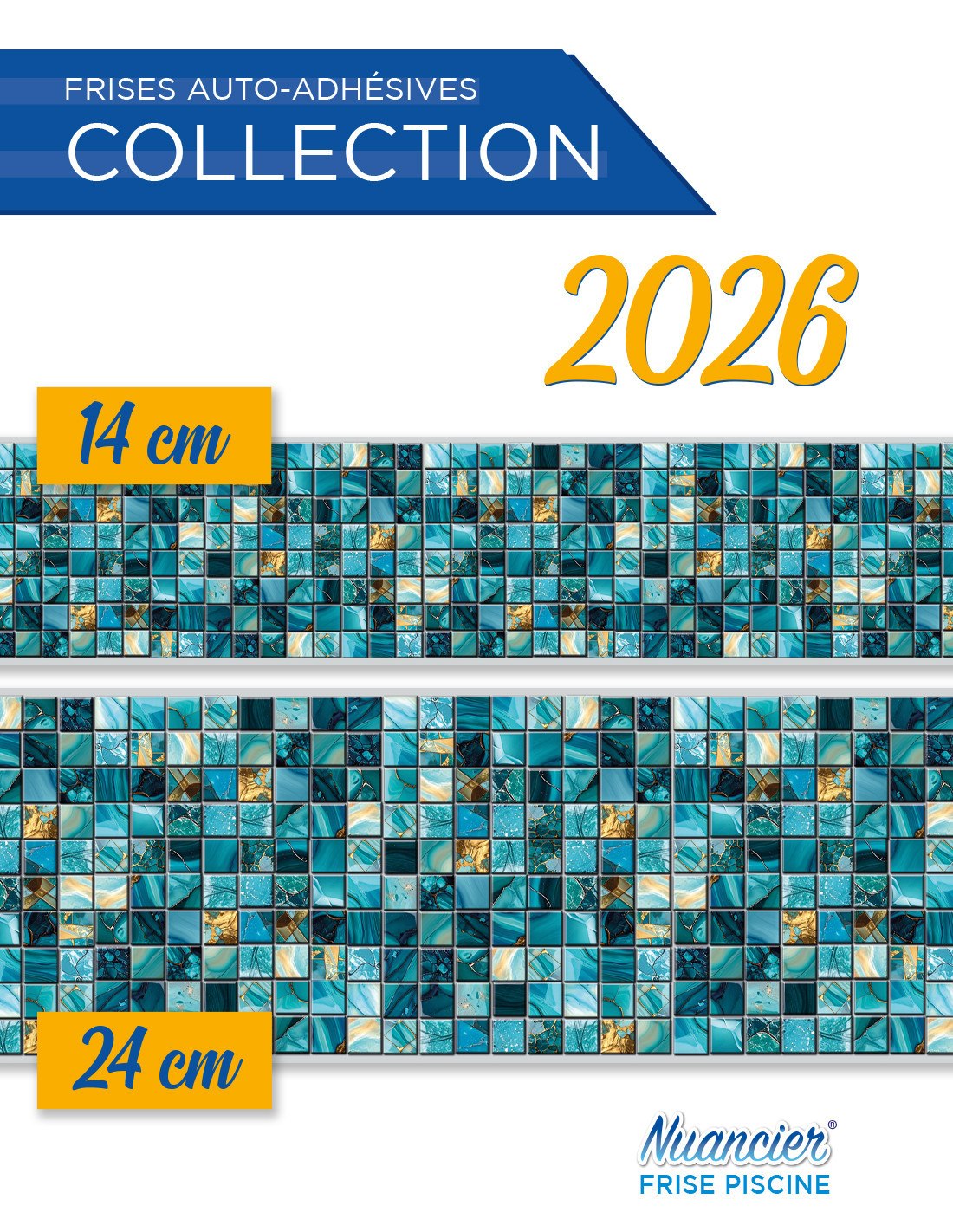 Venduto in rotoli da 5 metri, è disponibile in altezze di 14 cm o 24 cm. Queste strisce colorate con motivi ispirati al mosaico non presentano texture o rilievi.